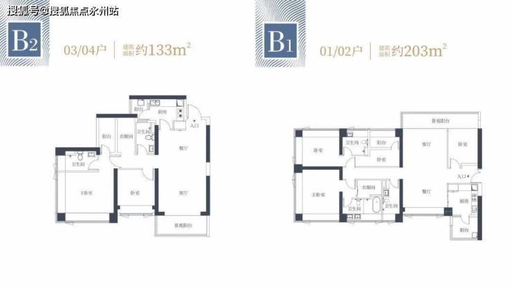 133㎡的3房2厅2卫,设计的传统竖厅格局,西南朝向;203㎡的4房2厅3卫,设计的是竖厅南北通透格局