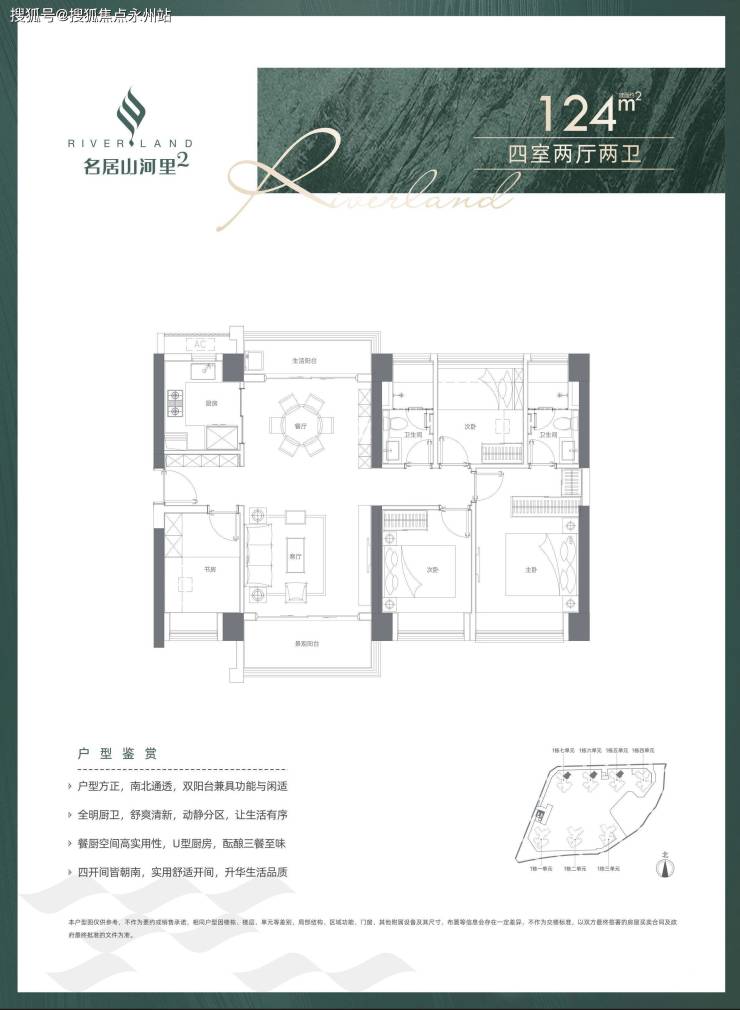 124㎡四室两厅两卫,设计的是南北通格局,客厅3.5米开间,南北通透双阳台,四开间朝南,全屋飘窗,U型厨房,得房率:71.36%(不含赠送),阳台1.5米进深,主朝东南向。