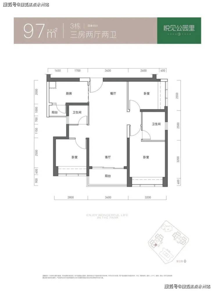 97㎡的3房2厅2卫,仅3栋4单元01户型,设计的是竖厅双龙抱珠格局,客厅3.4米开间,三开间朝南,3个卧室分别做到了3.2米/2.8米/255米的宽度,L型厨房带1个生活阳台,公卫三段式分离,得房率73.61%(不含赠送),东南朝向。