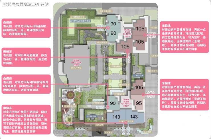 朝向:90㎡户型有三条腿,均为西偏南朝向,95㎡户型只有一条腿,为东偏北朝向,105㎡户型有4条腿,其中3条腿是东偏北朝向,1条腿为南偏东朝向,143㎡户型有2条腿,均为南偏东朝向。