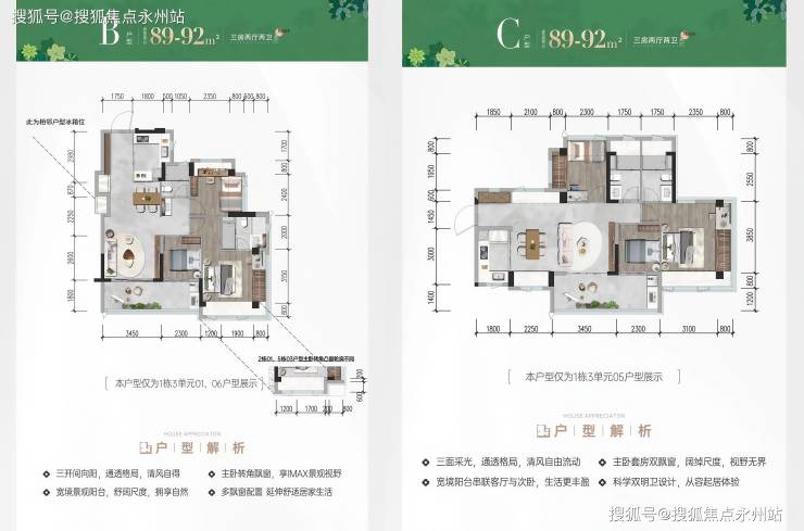 建面约 89-92㎡三房两厅两卫(竖厅 / 横厅双版本)