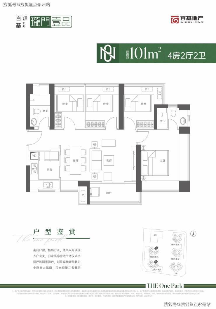 101㎡的4房2厅2卫,设计的是横厅南北通透格局,进门入户玄关,LDKB一体化设计,U型厨房,卫生间干湿分离,阳台主朝东南向。