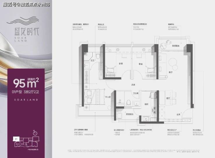 95㎡的3房2厅2卫,1栋C座01户型,设计的是经典竖厅格局,客厅3.35米开间,进门入户玄关,餐客厅一体化,主卧套间设计,L型厨房带1个生活阳台,卫生间干湿分离,得房率:约78%(不含赠送),阳台东北朝向。