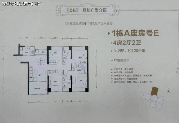 120㎡的4房2厅2卫,设计的是竖厅南北通透格局,双阳台设计,客厅3.6米开间,4个卧室分别是3.2/3.2/2.75/2.75米的宽度,U型厨房,得房率约:76%(不含赠送),阳台主朝东南、西北、东北向。