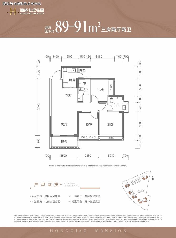 建面约89-91㎡3房2厅2卫:经典竖厅格局,LDKB 一体化设计,空间利用率高。客厅开间3.5米,主卧面宽3.05米,次卧面宽2.65米/2.35米(89㎡)或2.6米/2.55米(91㎡),L 型厨房带生活阳台,公卫三段式分离,部分户型南北通透,得房率约75.8%-76.9%(不含赠送)。