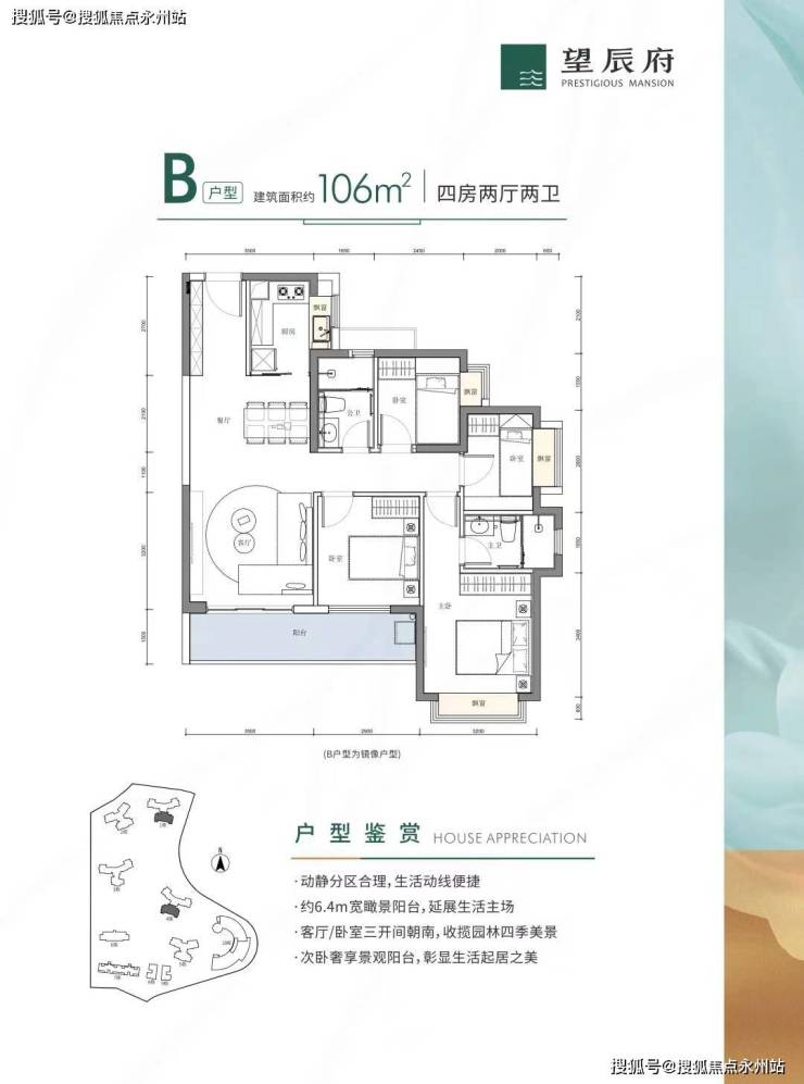 106㎡的4房2厅2卫,设计的是竖厅格局,客厅3.5米开间,三开间朝南,4个卧室分别是3.2米/2.9米/2.45/2米的宽度,L型厨房,得房率:80.14%(不含赠送),客厅连接卧室有1个6.4米长的超大阳台,朝正南或西南朝向,看花园景观。