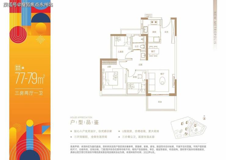 77-79平3房2厅1卫:经典竖厅设计,使用率77.65%(不包含赠送面积)