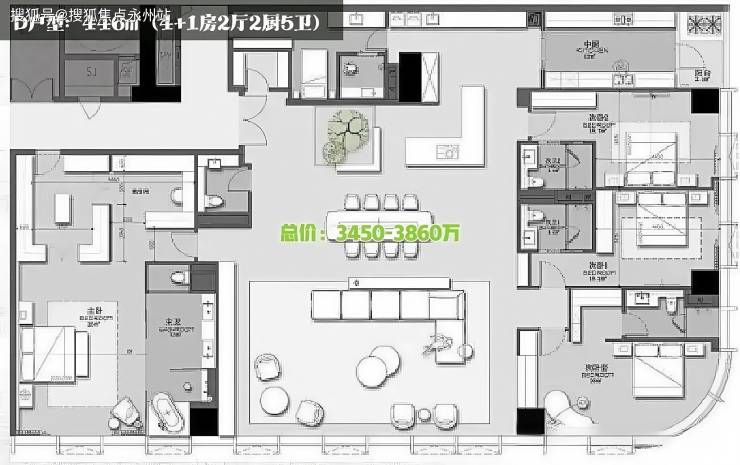 A户型:396㎡(3+1房2厅2厨5卫)LSD操刀、270°城市景观、全套房、双主卧设计、9.9米客餐开间、主卧面积高达24㎡、明卫设计。