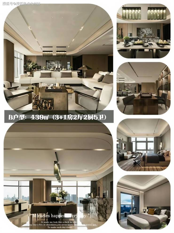 B户型:439㎡(3+1房2厅2厨5卫)LSD操刀、270°城市+绿化景观、高区看海、10米客餐开间。