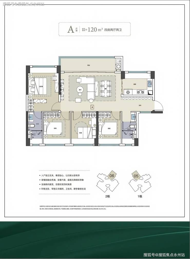 120㎡的4房2厅2卫,设计的是横厅南北通透格局,客餐厅6.7米开间,4个卧室,主卧大套间设计,U型厨房,公卫三段式分离,阳台主朝西南或东南向。