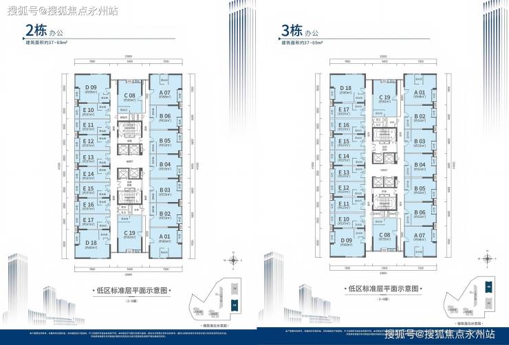 办公产品:分3.05m和4.5m层高,建筑面积约37-69㎡,共987套,4梯19户,户型方正,功能齐全,户型小总价低,空间利用率高,视野开阔,采光面优。