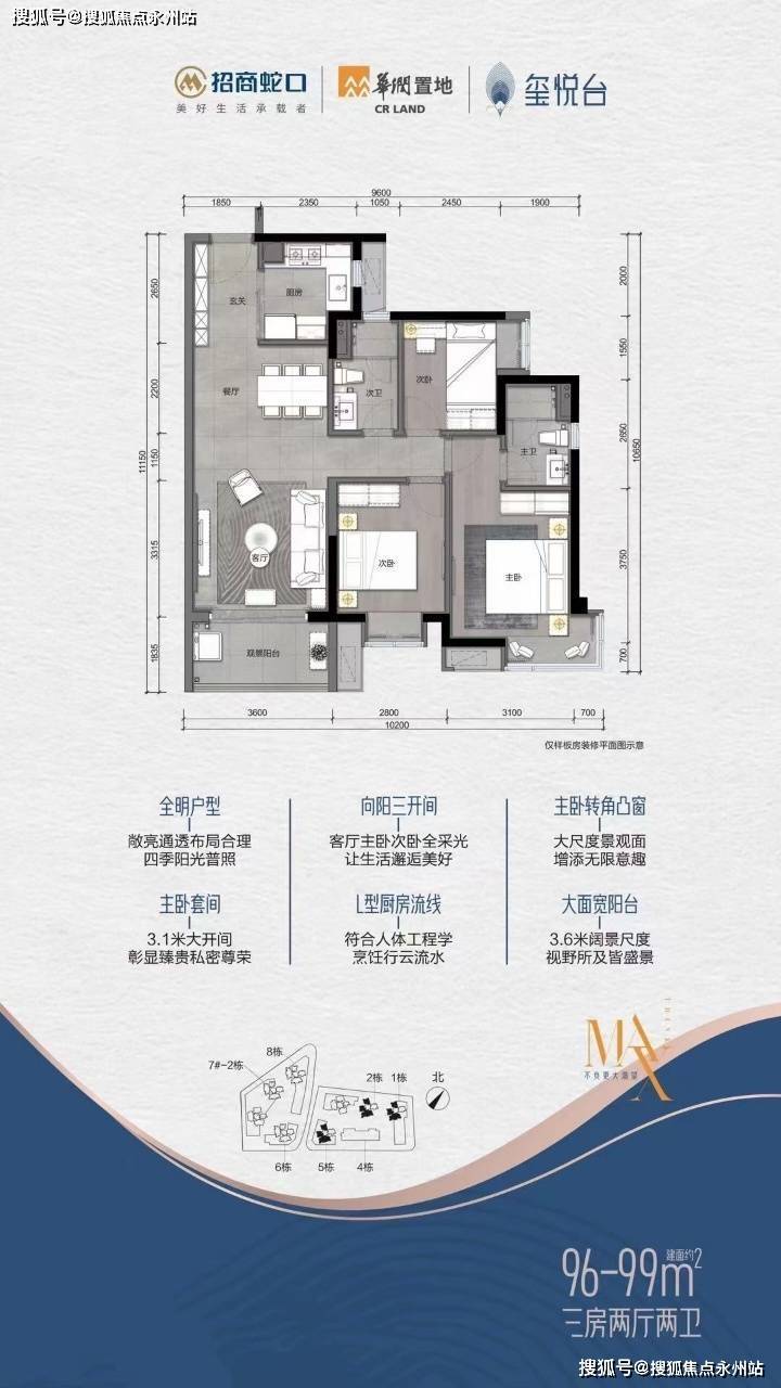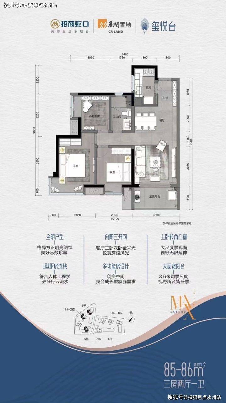 建面约85-113㎡三至四房,满足育龄、三代同堂等家庭空间需求,美好生活一步到位,户型格局方正,朝向采光俱佳,人性化设计厨房,阔景大阳台,主卧套房L字形凸窗设计等。