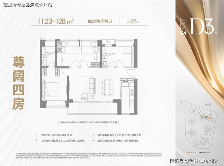 【建筑面积123-128㎡4房2卫】横厅南北通透格局,客餐厅6.6米开间,四开间朝南,主卧套房设计,6.6米超长观景阳台,得房率约72.45%(不含赠送),阳台主朝正南向。