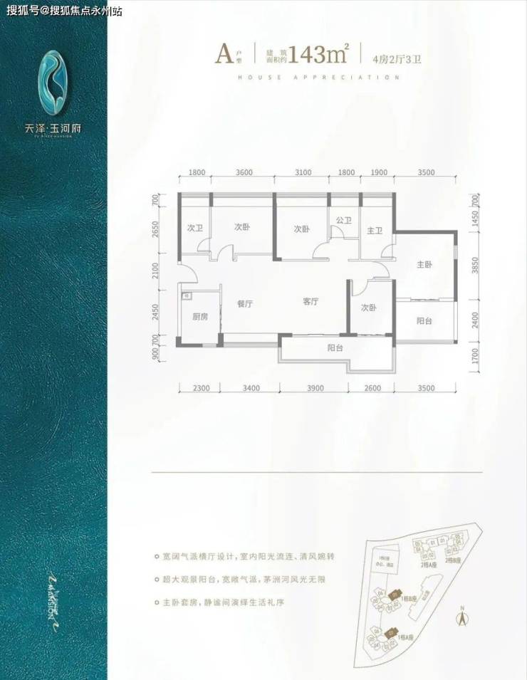 A户型-143㎡-4房2厅3卫,设计的是横厅南北通透格局,客餐厅开间7.3米,超大观景阳台6.5米长,全屋飘窗设计,主卧套房设计。