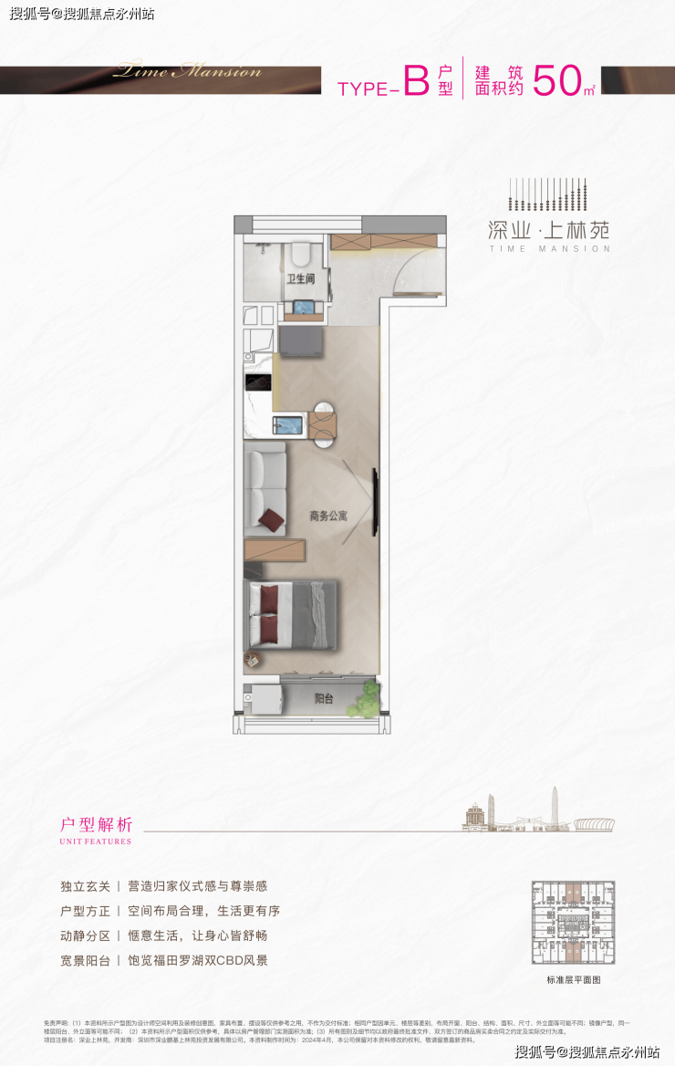 产品形态:主推40-97㎡精装商务公寓,主力户型为40-50㎡小户型(占比80%),另有少量20-36层改善型套房,涵盖1-3房全生命周期需求。