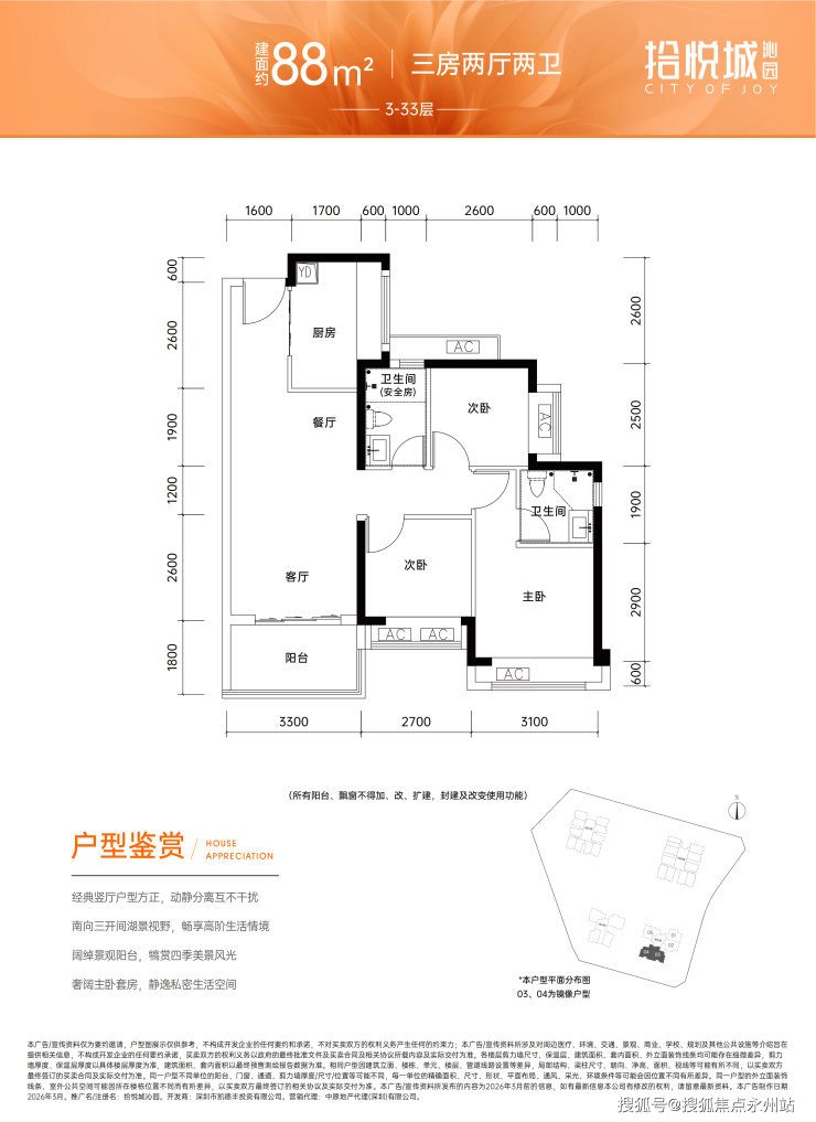 建面约88㎡ 三房两厅两卫,核心亮点:三开间南向设计,全屋通透,采光效果极佳,餐客厅LDK一体化布局,空间利用率高,配备1.8m进深大阳台,可兼顾晾晒与休闲,部分户型可享南向一线湖景视野,双卫设计,满足多人口家庭使用需求,避免早晚使用拥堵,居住舒适度较高。