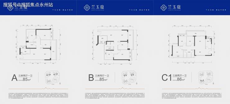 建面约85-86㎡三房两厅一卫:竖厅设计,LDKB 一体化(客餐厅、厨房、阳台连通),三开间朝南,采光通风佳。