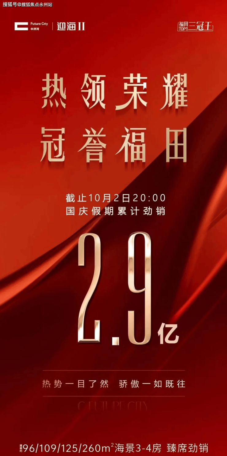 新政后,热销楼盘中洲湾·迎海再次引领市场热潮。福田中洲湾·迎海二期于3月30日盛大开盘选房,当天推出560套精品房源,迅速去化50%,即约280套房被抢购一空,销售额高达27.1亿!