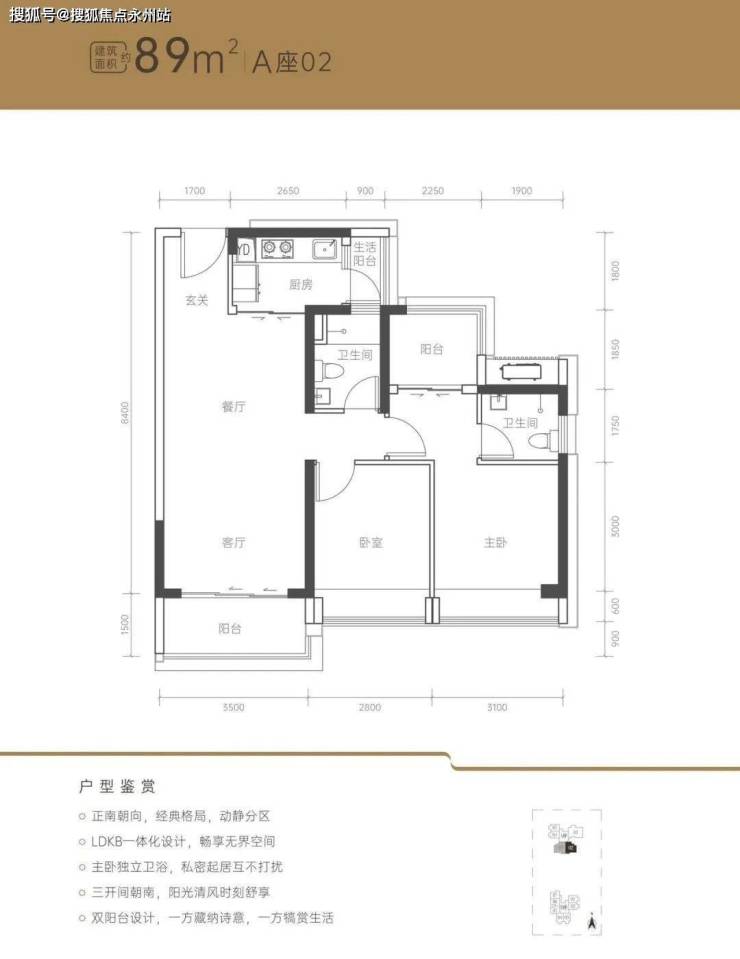 89平三房两卫户型:正南朝向,经典格局,动静分区;LDKB一体化设计,畅享无界空间;主卧独立卫浴,私密起居互不打扰;三开间朝南,阳光清风时刻舒享;双阳台设计,一方藏纳诗意,一方犒赏生活。