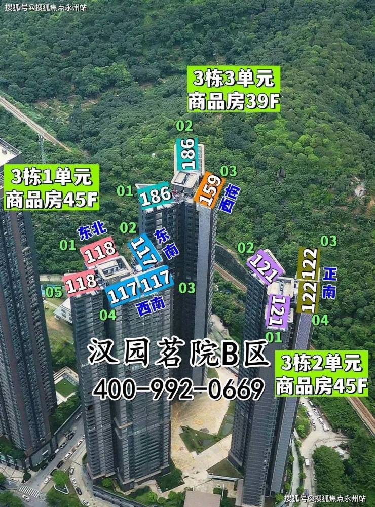 汉园茗院B区474套117--122/160/187平四房,1单元、2单元层高三米,3单元层高3.6米;总楼层39--45层。于2025年6月毛坯交付