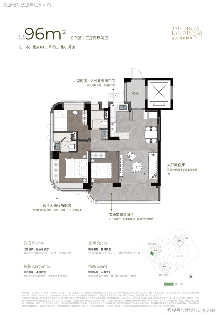 96m²三房两厅两卫的E户型:从空间布局来看,U 型厨房的设计极为人性化,大开间客厅与宽阳台是整个户型的最大亮点,西南向视野使得整个户型采光充足,贯通式阔景阳台与客厅、卧室双通,极大地拓展了生活空间的宽度。主卧的飘窗台也是一大亮点,弧形无柱转角飘窗不仅提供了广阔的视野,还增加了室内的采光。