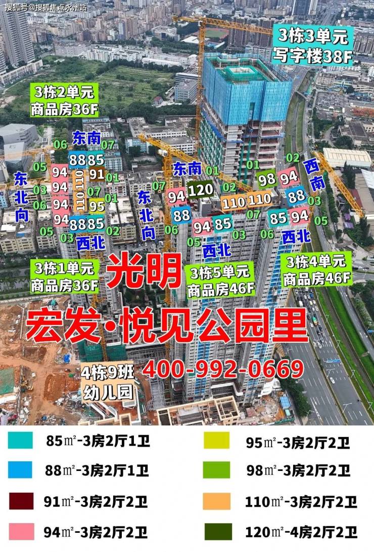 宏发悦见公园里位于光明区振明路,总建面33.8万㎡,共推出803套房源,户型面积涵盖85-120㎡的3-4房,备案均价为46959元/㎡,总价区间为381万至653万。楼栋类型为高层/超高层,总层高在36-46层之间,容积率为7.58,梯户比为3T6,车位比为1:1.48。开发商为深圳市天荣盛房地产开发有限公司。