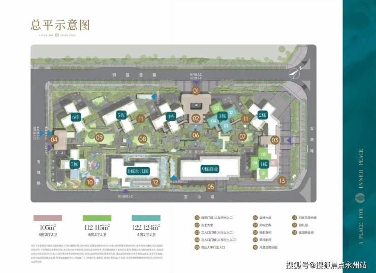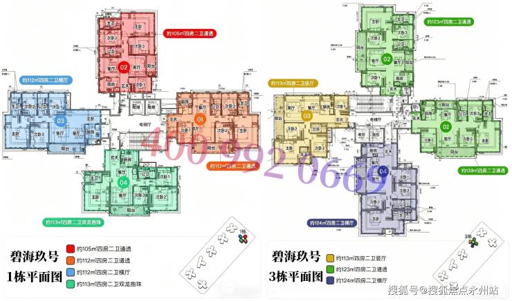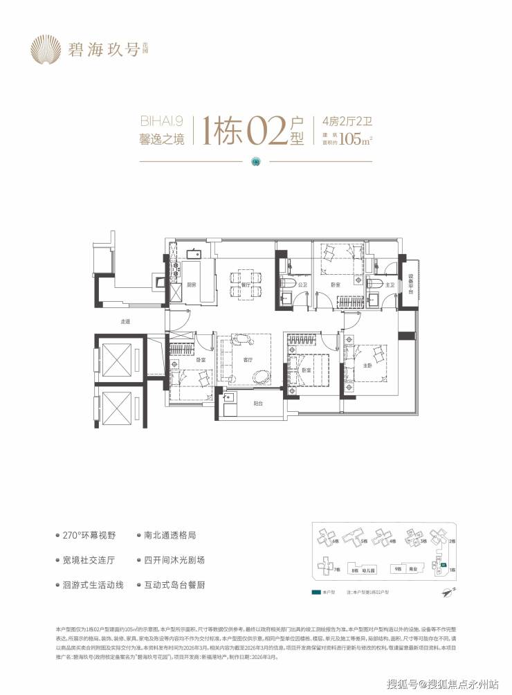 105㎡ 4房2厅2卫(入门级改善):采用竖厅南北通透格局,餐客厅分离设计,四开间朝南,全屋配备十面飘窗,主卧拥有270°无柱转角飘窗,U型厨房设计,卫生间干湿分离,得房率约100%(含赠送面积),阳台朝向东南,适配二胎家庭或三代同堂的基础改善需求。