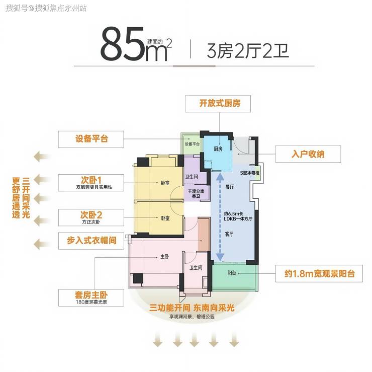 85㎡三房两厅两卫:竖厅设计,三开间朝南,客厅开间3.2米,连接进深阳台。主卧面积约16.41㎡,带独立卫生间和180°环幕飘窗,次卧约7.4-7.71㎡。