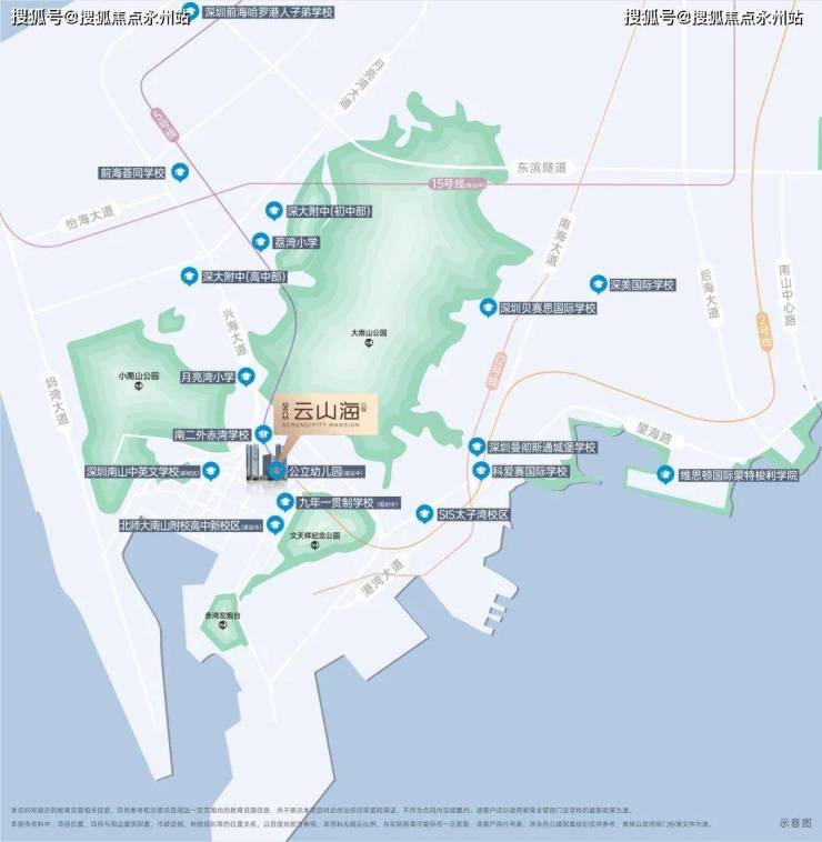 🔘周边教育信息介绍:社区自带双18班幼儿园、直线距离约280米公办九年一贯制南二外赤湾学校、九年一贯制学校(规划中)、深大附中高中部、北师大南山附校高中新校区(即市第三十高级中学,建设中)