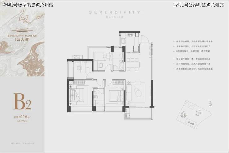 设计上跟建面约116㎡B2户型类似,不过公摊、尺寸和细节上有不同。该户型取消了小次卧的L型飘窗设计,采用了大阳台的设计横穿到次卧,主朝向的视野更开阔。动静分区,四开间南向。经典的竖厅格局,动静分离,一体化餐客厅让空间观感更通透。约6.8米南向阳台视野开阔,次卧连接阳台可以看到园林景观,绿意在前,在阳台晾晒衣服时也是一种享受。经典的竖厅格局,动静分离。客厅、厨房、餐厅和阳台也能实现空间一体化,构成家的核心区。