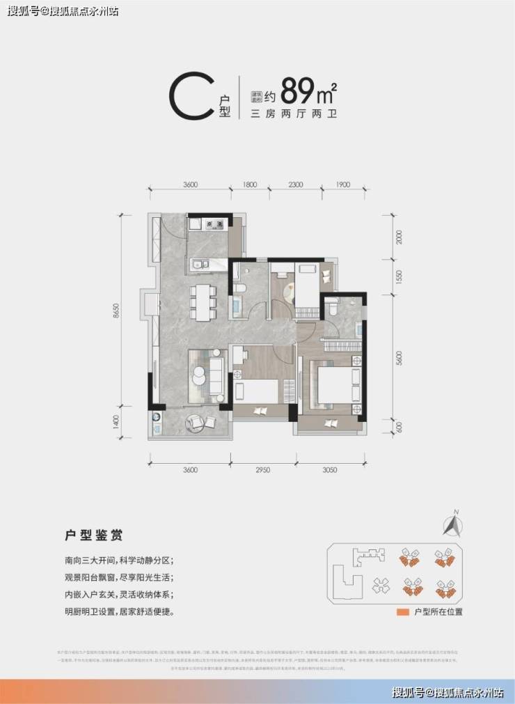 约89㎡三房两卫(1栋2单元2栋3栋1/2单元03/04/05/06户型)传统竖厅格局,动静分区结构,客厅开间约3.6米,主卧开间约3.05米,有西南和东南朝向。