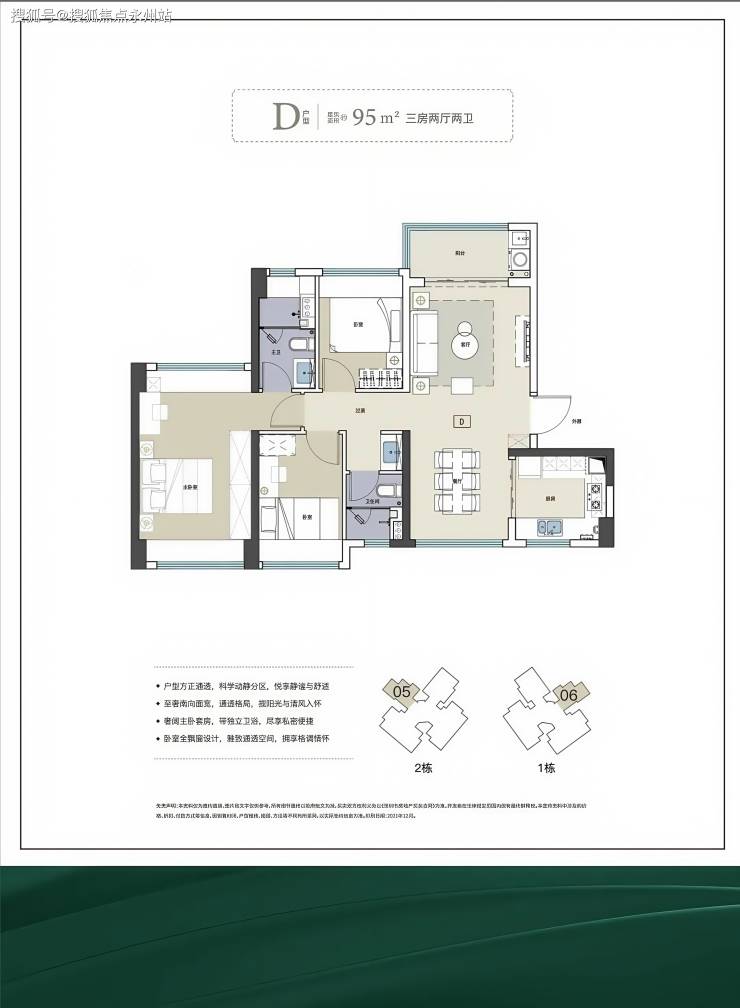 95㎡的3房2厅2卫(02.03户型),设计的是竖厅格局,进门独立玄关,客厅3.65米开间,S墙设计预留冰箱位,三开间朝南,3个卧室分别做到了3.1米/2.9米/2.6米的宽度,U型厨房,公卫三段式分离,得房率:80.07%(不含赠送),阳台朝西南或东南向。