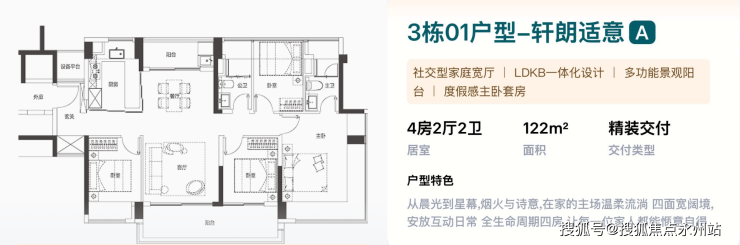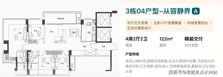 122㎡的4房2厅2卫,3栋04户型,设计的是横厅南北通透格局,独门独户,客餐厅一体化,五开间朝南,度假感主卧套房,主卧270°无柱转角揽景飘窗,U型互动式岛台餐厨,卫生间干湿分离,得房率约100%(包含赠送),客餐厅出超大阳台,西北朝向看公园景观。