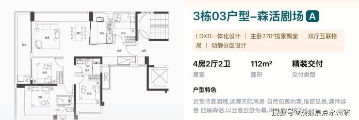 112㎡的4房2厅2卫,3栋03户型,设计的是竖厅格局,进门独立入户玄关,LDKB一体化设计,主卧270°无柱转角揽景飘窗,U型互动式岛台餐厨,卫生间干湿分离,得房率约100%(包含赠送),客厅连接次卧出大阳台西北朝向,看公园景观。