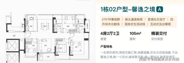 105㎡的4房2厅2卫,1栋02户型,设计的是竖厅南北通透格局,独门独户,餐客厅分离化设计,四开间朝南,主卧270°无柱转角飘窗,U型互动式岛台餐厨,卫生间干湿分离,得房率约100%(包含赠送),阳台东南朝向看恒生医院。