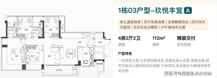 112㎡的4房2厅2卫,1栋03户型,设计的是横厅南北通透格局,独门独户可做800库,餐客厅一体化设计,进门超长飘窗敞阔采光面,五开间朝南,主卧270°无柱转角飘窗,U型互动式岛台餐厨,卫生间干湿分离,得房率约100%(包含赠送),客餐厅出超大阳台西南朝向看小区园林。