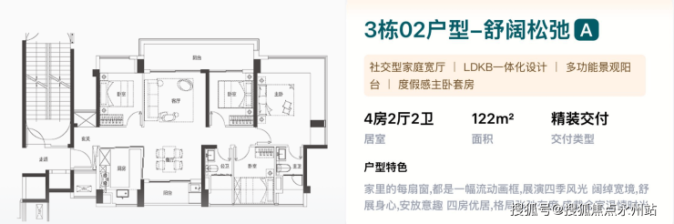 122㎡的4房2厅2卫,3栋02户型,设计的是竖厅南北通透格局,独门独户,进门入户玄关可做800库,LDKB一体化,双阳台设计,五开间朝南,度假感主卧套房,主卧270°无柱转角揽景飘窗,U型互动式岛台餐厨,卫生间干湿分离,得房率约100%(包含赠送),客厅连接次卧出超大阳台,西北朝向看公园景观。