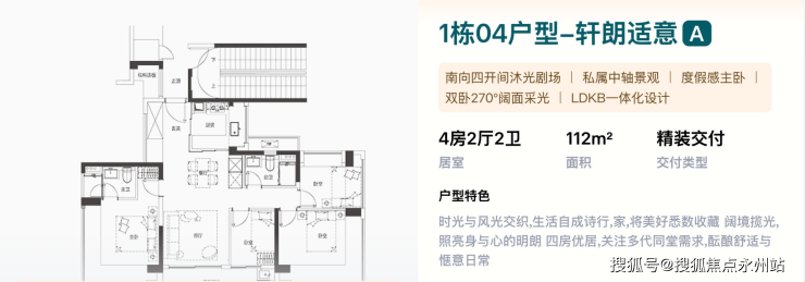 112㎡的4房2厅2卫,1栋04户型,设计的是竖厅双龙抱珠格局,独门独户,LDKB一体化设计,四开间朝南,主卧+1个次卧270°无柱转角飘窗,U型互动式岛台餐厨,卫生间干湿分离,得房率约100%(包含赠送),客厅连接次卧出大阳台,西南朝向看小区园林。