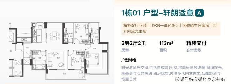 113㎡的4房2厅2卫,1栋01户型,设计的是竖厅南北通透格局,LDKB一体化设计,进门入户玄关可做800库,四开间朝南,度假感主卧套房,主卧270°无柱转角飘窗,U型互动式岛台餐厨,卫生间干湿分离,得房率约100%(包含赠送),客厅连接次卧出超大阳台,主朝西南向看小区园林。
