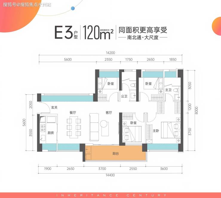 89㎡三房两卫:经典竖厅,三开间朝南,客厅开间3.5米,三分离卫生间设计,功能分区明确。
