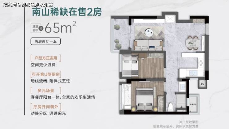 65㎡两房两厅一卫:LDKB一体化设计(客餐厅、厨房、阳台连通),客厅开间2.95米,U型厨房预留双开门冰箱位,卫生间三段式干湿分离,部分户型配备1.5㎡设备平台可改造为家政间。