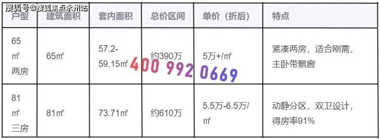 户型面积:主力为65㎡两房(得房率88-91%)和81㎡三房(得房率91%),均为新规设计,实际使用面积接近传统70-85㎡户型。