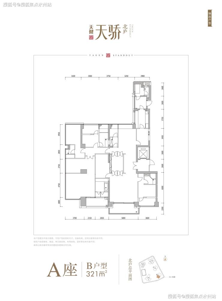 1栋A座:148米,46层,共85户,朝南为主,三梯两户,约266-321平,427平(顶复)