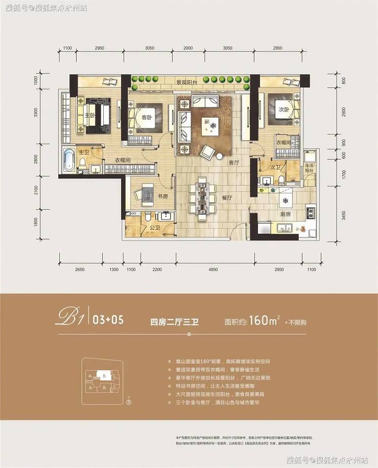160㎡四居室:折后单价4.2万-4.5万/㎡,总价约672万-720万,备案价为6.5万-7.1万/㎡,为项目“楼王”户型,享有270°环幕山海景观。