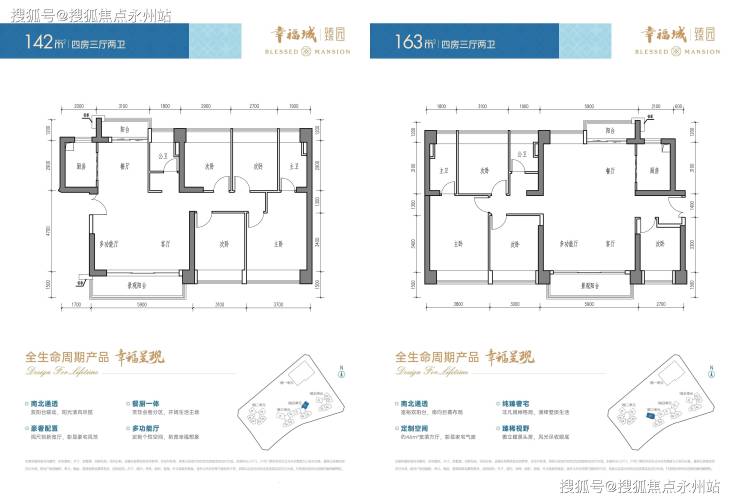 142-163㎡四房三厅两卫(方厅设计)得房率约87.1%-88.25%(含赠送)