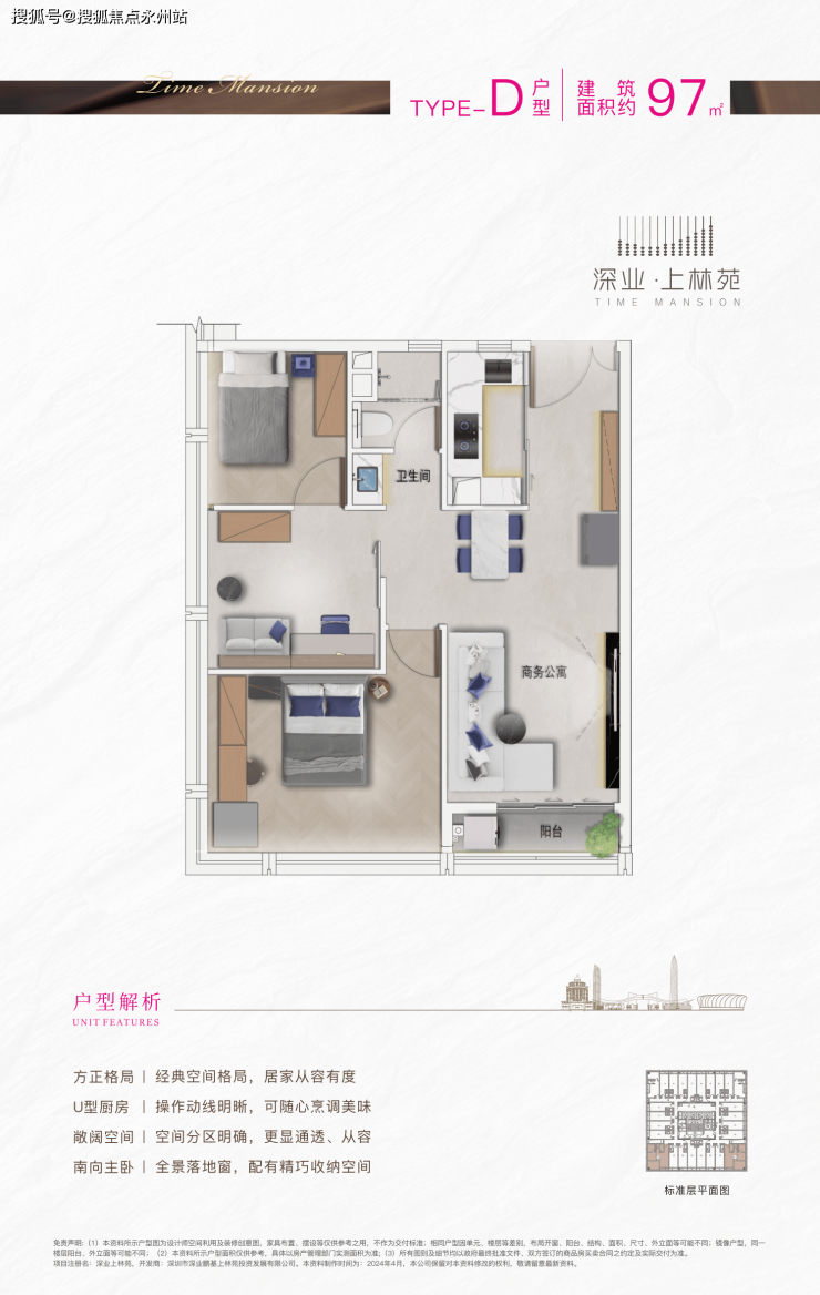 产品形态:主推40-97㎡精装商务公寓,主力户型为40-50㎡小户型(占比80%),另有少量20-36层改善型套房,涵盖1-3房全生命周期需求。