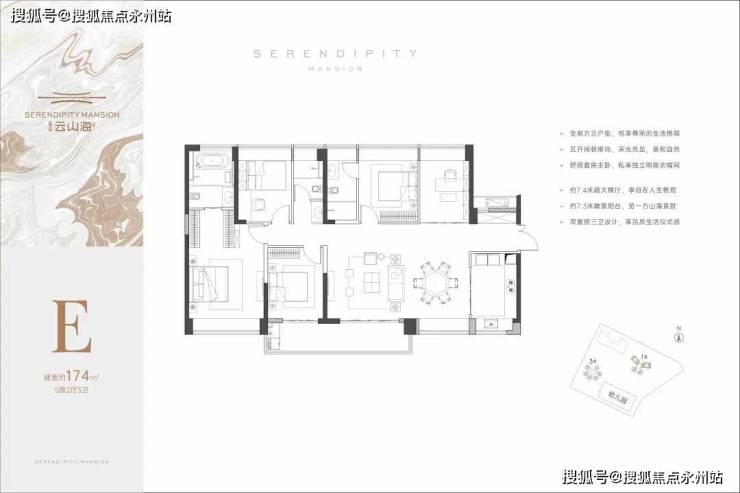 174㎡的5房2厅3卫:分布在1栋的01.02户型,设计的是横厅格局,客餐厅一体化7.4米开间,客厅连接次卧出大阳台(7.3米长),三开间朝南,全屋飘窗,双套房设计,卧室宽度分别为4/3.2/3/2.9/2.6米,U型厨房,公卫三段式分离,阳台主朝西南向。