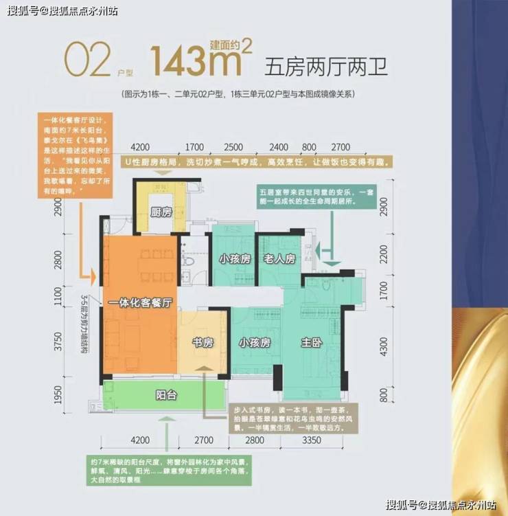 143㎡五房两厅两卫:竖厅格局,客厅4.2米开间,带6.9米长大阳台,有东南、西南朝向,客餐通厅 尽显大宅显赫气派,五房格局 完满三世同堂幸福生活