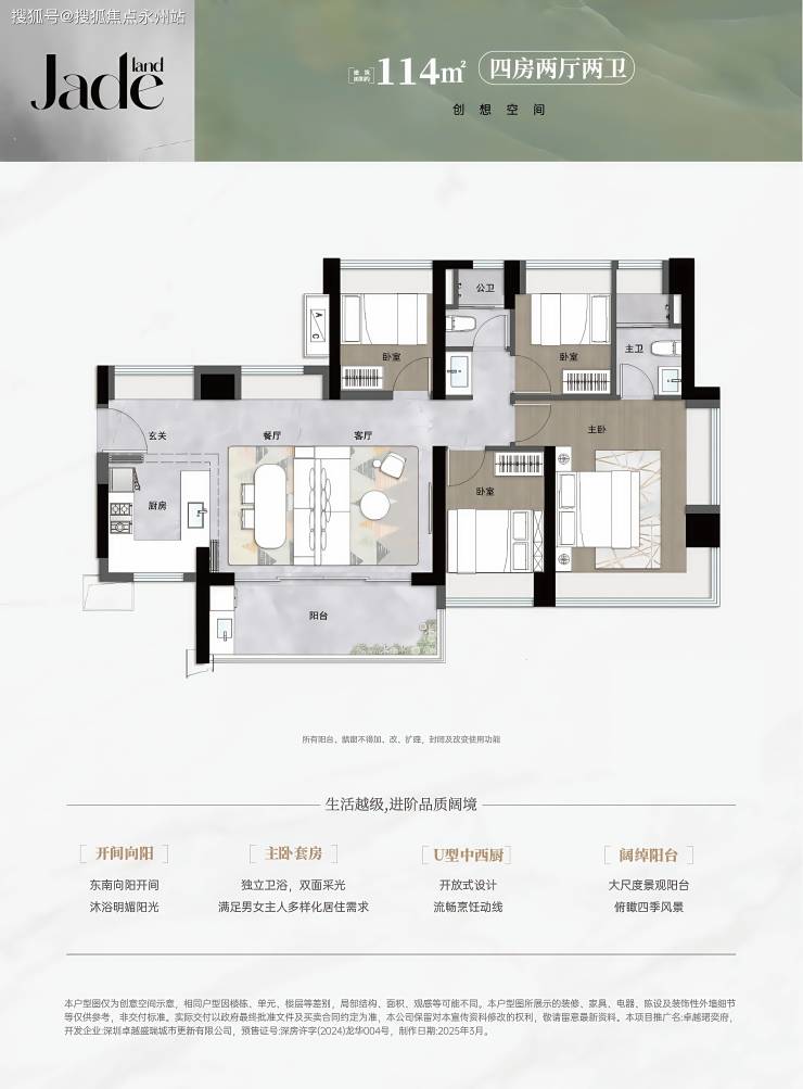 114平四房两卫只有一个07户型,横厅设计,东南朝向,南北通透,三面采光,舒适度非常好,看花园景观,视野不错。