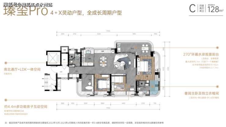 约128㎡的户型可以说是升级版的107 ㎡,整体空间设计不仅保证大横厅的尺度,总面宽近 15.5 米,比107㎡户型更南北通透、采光面更宽、阳台更大。在功能上,既设计了全明书房和奢阔主卧,还考虑到了亲子的成长陪伴空间。作为 4+X 的灵动户型,无论一个小孩还是两个小孩的家庭需求都可以满足,陪伴家庭的全周期成长。